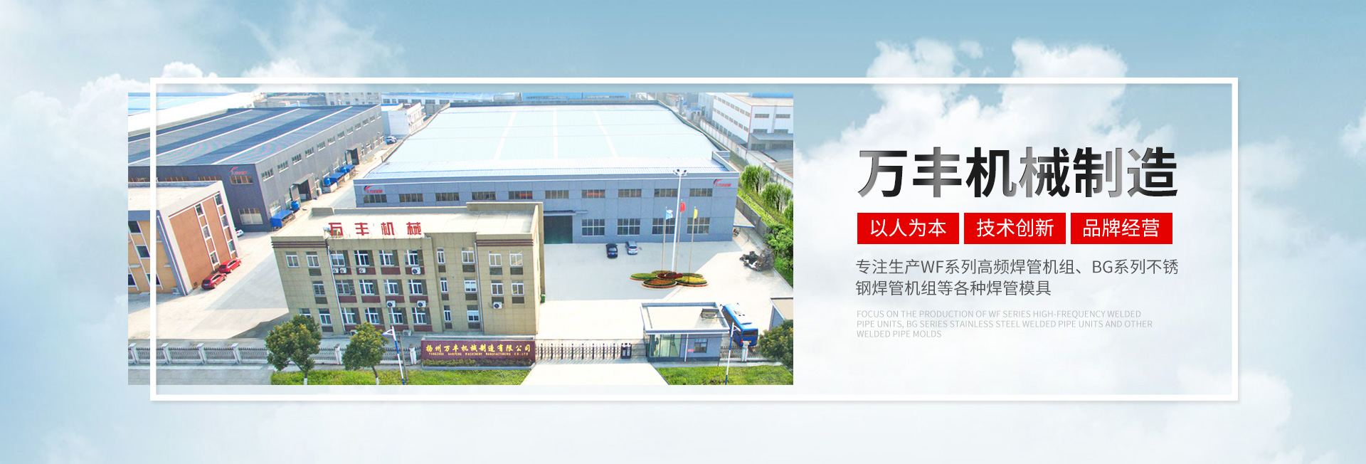揚州萬豐機械制造有限公司坐落于揚州北郊槐泗工業(yè)園區(qū),占地25000平方米,交通便利,是集開發(fā)、制造、銷售為一 體的焊管機組、模具制造企業(yè)。主要生產(chǎn)WF系列高頻焊管機組;BG系列不銹鋼焊管機組;GW系列型材冷彎成型機組;CQ系列車圈機以及各種焊管模具(12機組至508機組)型材模具。采用ISO9001: 2000國際質(zhì)量標準,擁有完善的質(zhì)量保證體系、嚴格的管理制度、先進的檢測手段和完善的售后服務隊伍。公司秉承“以人為本、技術創(chuàng)新、品牌經(jīng)營、追求品質(zhì)”的發(fā)展理念。堅持質(zhì)量立企和品牌興企的發(fā)展戰(zhàn)略與時俱 進,將人才和先進的管理、完善的設計與服務相結(jié)合。不斷開發(fā)與創(chuàng)新使我們的產(chǎn)品始終處于同行前列地位,同時也得到國內(nèi)了外廣大用戶的信賴和盛贊。 成功始于誠信,實力鑄就品牌,服務創(chuàng)造未來。二十一世紀是科技經(jīng)濟高速發(fā)展的時代。競爭與發(fā)展并存,機遇與挑戰(zhàn)同在。萬豐人將以“忠誠、務實、拼搏、創(chuàng)新”為企業(yè)精神,以敏銳的目光昂揚的姿勢面向一個更加廣闊的市場和未來。